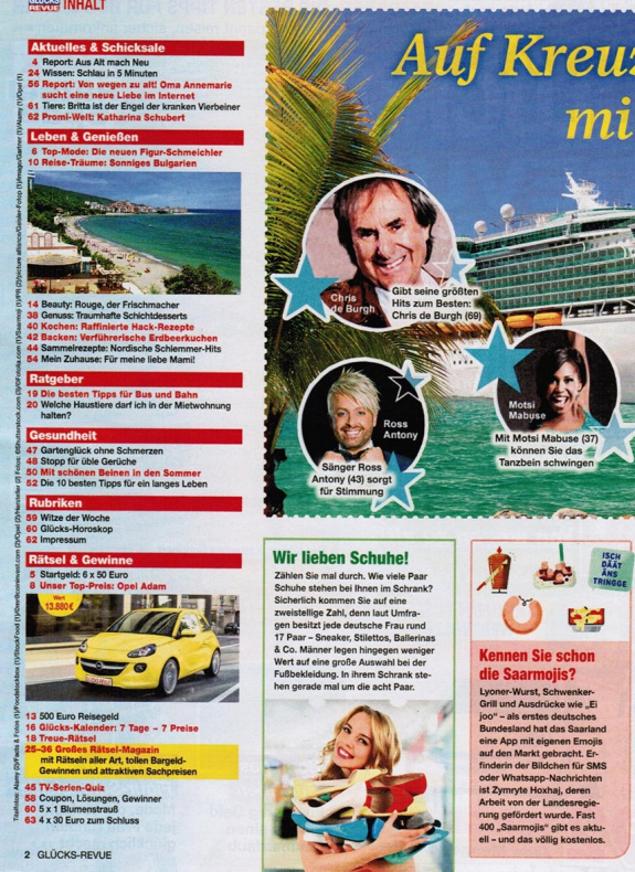 Die Glücksrevue ist die Zeitschrift für alle, die ihr Leben mit inspirierenden Ideen, spannenden Ratgebern und wertvollen Tipps bereichern möchten. Jede Woche bietet die Glücksrevue vielfältige Inhalte, die positive Impulse für Körper, Geist und Seele setzen.